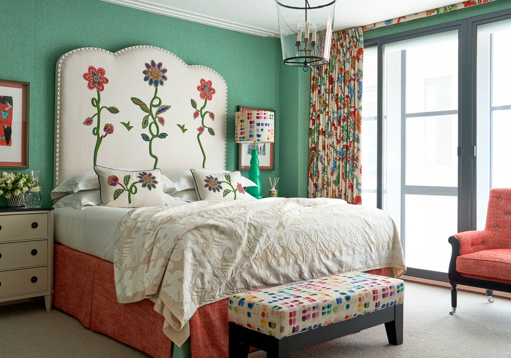 The Spring Flower Appliqué Ruby Headboard makes a bold statement with three beautifully hand-appliquéd spring flowers in vibrant pink and green tones, set against a soft linen backdrop. The iconic Ruby shape adds architectural flair, featuring a shallow, triple-curved top and a delicately studded edge. The headboard’s mix of colours in the appliqué design makes it extremely versatile, effortlessly complementing a variety of bedding and room décor. It’s a stunning addition to any bedroom.