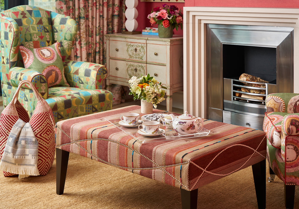 This new incarnation of Kit Kemp's Wing chair, upholstered in Kit's Potato Print fabric from her new collection with G P & J Baker, has naïve clock shapes in primary colours against a pea green background and is a statement piece for any room. All Kit Kemp furniture is beautifully handcrafted and made to order in a range of Kit Kemp fabrics, bespoke to your room scheme. Lead time 8-10 weeks.